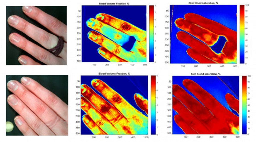 圖 2:用光譜相機(jī)研究手指閉塞以及相關(guān)的血容量分?jǐn)?shù)和皮膚血飽和度