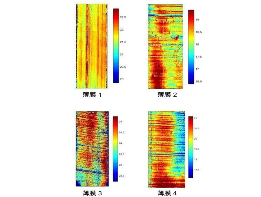用 Matlab 將光譜干擾轉(zhuǎn)換成厚度熱圖。由 FX17 光譜數(shù)據(jù)計(jì)算的平均厚度為 18.4、20.05、21.7 和 23.9 um。標(biāo)準(zhǔn)偏差分別為 0.12、0.076、0.34 和 0.183 um。測量時(shí)薄膜沒有拉伸。這解釋了為什么測量值略高于標(biāo)稱值。此外還檢測到缺陷。在薄膜 1 中,我們發(fā)現(xiàn)了兩個(gè)淺凹槽,可能是由局部壓力引起的。