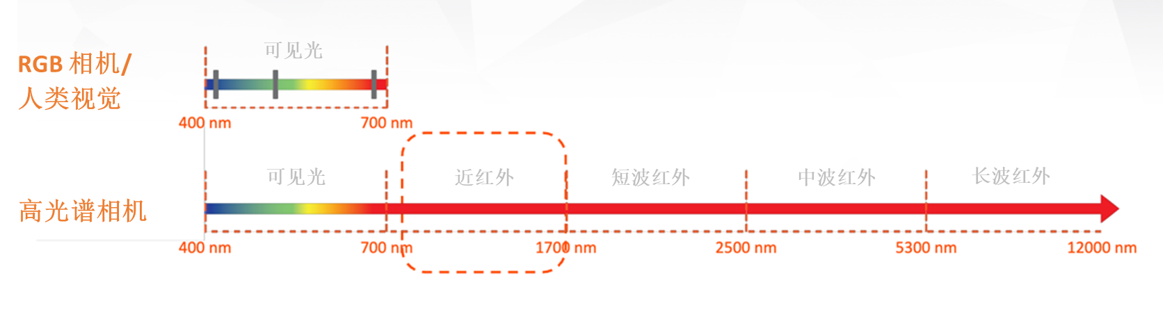 圖 1:NIR 高光譜成像可捕獲電磁波譜中 900 至 1700 nm 波長(zhǎng)范圍內(nèi)的光譜信息。