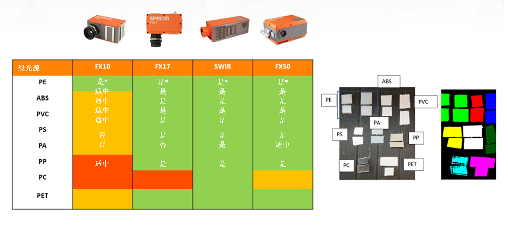 圖 3:Specim FX17 NIR高光譜相機(jī)可以區(qū)分常見(jiàn)的聚合物材料,包括 PE、ABS、PVC、PS、PA、PP 和 PET。