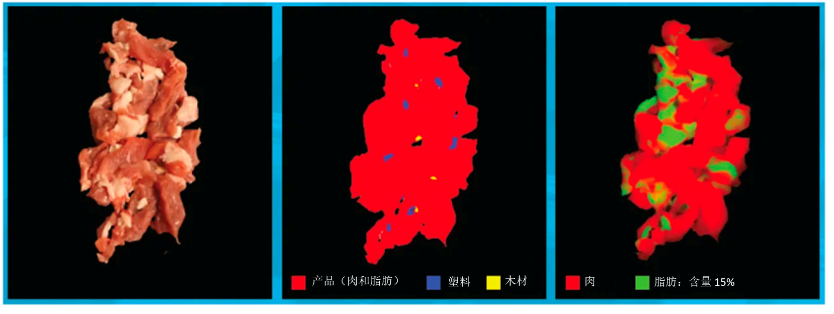 如圖 6 所示,使用 RGB 相機(jī)很難區(qū)分脂肪、肉以及污染物(如塑料或木材等)。然而,NIR HSI 可以準(zhǔn)確識(shí)別這些污染物并檢測(cè)脂肪在肉中的位置,因?yàn)樗鼈兊墓庾V特征不同。
