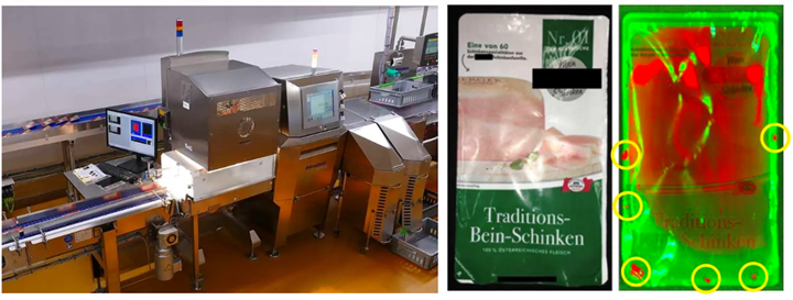 NIR 成像可以超出肉眼所及的范圍,檢測(cè)隱藏在密封包裝中的熔化油脂等污染物。這種污染通常是人眼不可見(jiàn)的。如果熔化的油脂位于包裝上的不透明印刷區(qū)域后面,則傳統(tǒng)的 RGB 成像將無(wú)效。但是,NIR HSI 具有更大的穿透深度,可以檢測(cè)到熔化的油脂,凸顯了該技術(shù)在質(zhì)量和安全檢查方面的強(qiáng)大功能。Minebea 報(bào)告了一個(gè)將 Specim FX17 與 X 射線成像結(jié)合使用來(lái)實(shí)現(xiàn)這一目標(biāo)的成功案例。