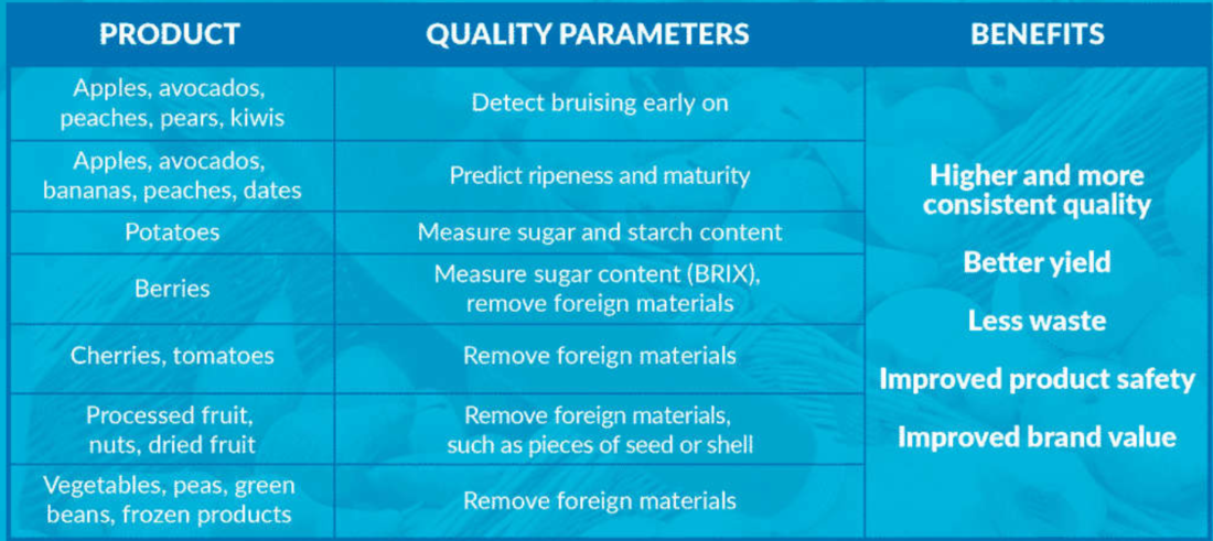 檢測果皮下的瑕疵和擦傷,確定成熟度和化學(xué)質(zhì)量,不受水果顏色和大小的影響,發(fā)現(xiàn)并去除塑料、木材、紙張、金屬或昆蟲等異物。Specim FX相機(jī)比傳統(tǒng)的彩色和濾光相機(jī)或點(diǎn)光譜儀能揭示更多信息。
