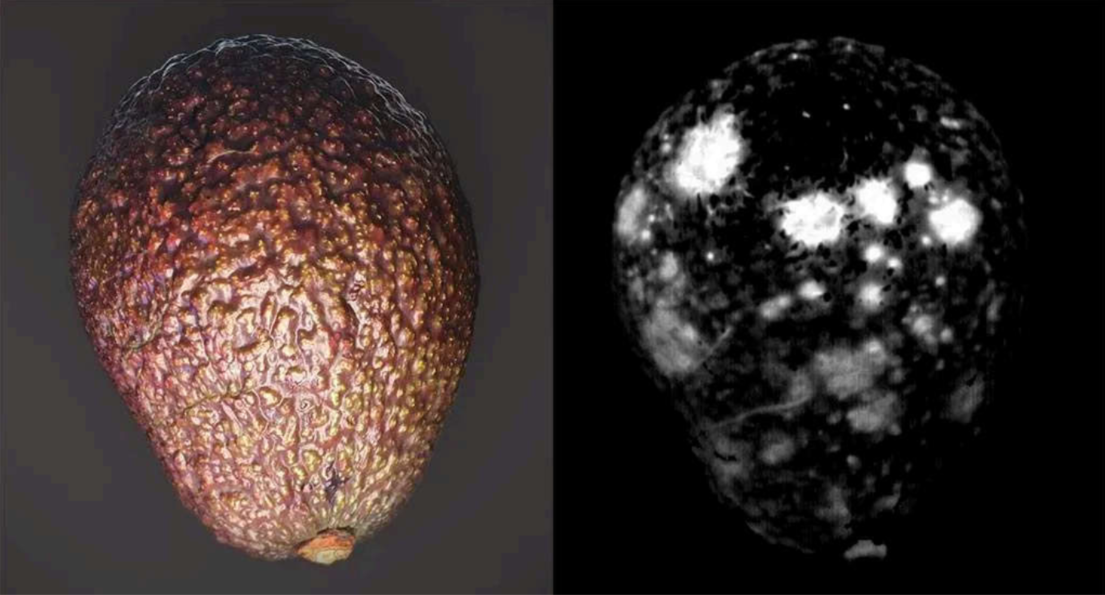 光譜成像顯示鱷梨皮下的瑕疵。圖片由 LuxFlux 提供。