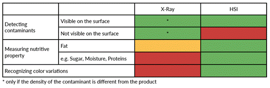高光譜成像本身并不能解決所有問題,但它應(yīng)該被視為一種補充技術(shù),尤其是對 X 射線的補充。高光譜成像無法看透樣品,而 X 射線可以穿透產(chǎn)品并檢測產(chǎn)品內(nèi)部的污染物。然而,由于 X 射線依賴于密度變化檢測,因此它們無法表征營養(yǎng)特性,也無法檢測密度與產(chǎn)品相似的污染物。