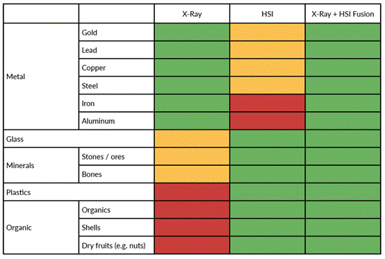 表2. X射線和高光譜成像技術(shù)如何互補以檢測不同種類的材料?