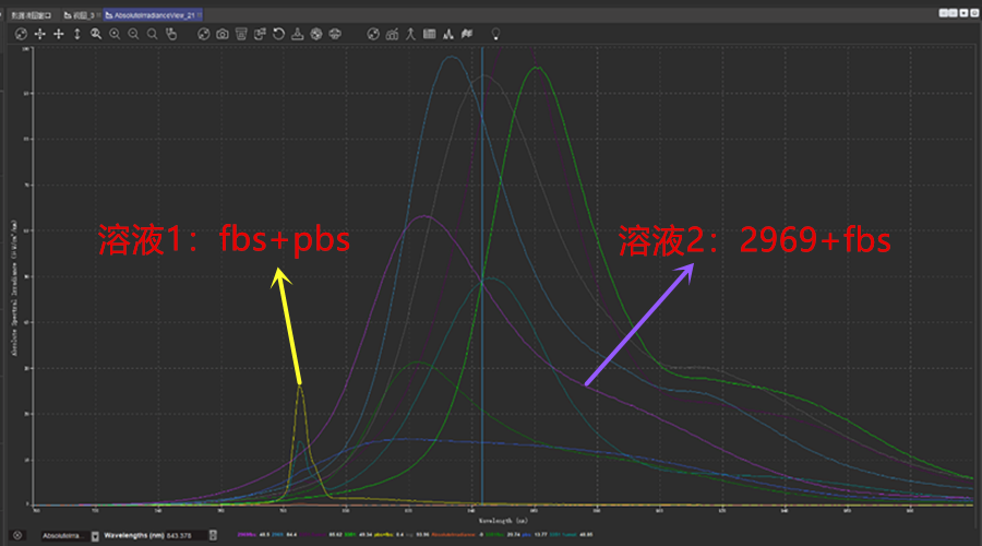 在實(shí)驗(yàn)過程中,使用不同波長的近紅外激發(fā)光源,激發(fā)相同物質(zhì)不同濃度溶液以及相同濃度不同物質(zhì)溶液的熒光顯影劑,通過觀測(cè)激發(fā)的熒光的位置以及熒光強(qiáng)度,探索不同熒光顯影劑的最佳激發(fā)波長,比較不同顯影劑的激發(fā)效率,從而獲得適用于人體的最佳的顯影劑藥物,在實(shí)驗(yàn)過程中只需將配置好的顯影劑溶液放置在圖3實(shí)驗(yàn)裝置的色皿中,即可立即從光譜儀軟件中顯示該顯影劑溶液的熒光位置和強(qiáng)度大小,如圖2所示。使用海洋光學(xué)便攜式的微型光譜儀,大大提高了實(shí)驗(yàn)效率。