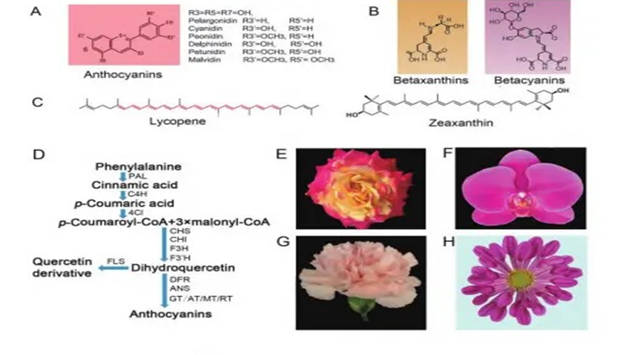 決定植物花瓣呈色的化學物質包括類黃酮/花青素苷、類胡蘿卜素和甜菜色素。細胞內葉綠素及金屬離子對不同色素結構的耦合作用對花瓣的最終呈色也會產生影響,以上3種色素代表了植物花瓣呈色的主要類型,其在花瓣細胞中含量多少,成分差異是花色多樣性的化學基礎。