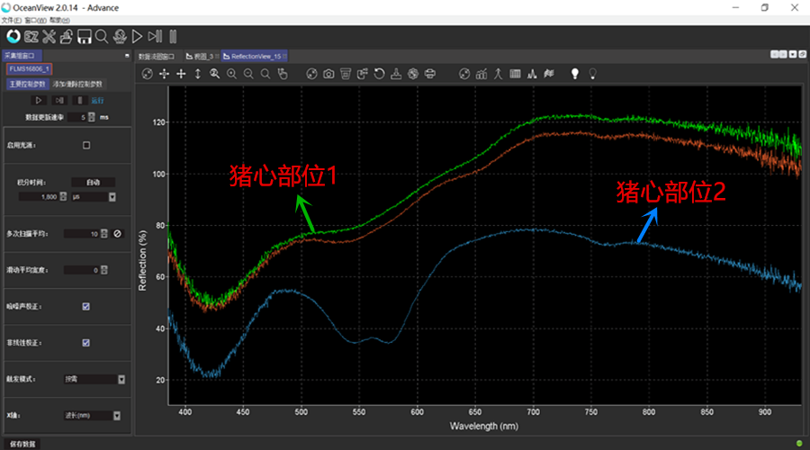 在實(shí)驗(yàn)過(guò)程中只需將不同消融程度的心臟組織放置在圖3實(shí)驗(yàn)裝置的反射支架上,即可立即從光譜儀軟件中顯示該消融組織的反射光譜圖,如圖2所示。使用海洋光學(xué)便攜式的微型光譜儀,大大提高了實(shí)驗(yàn)效率。